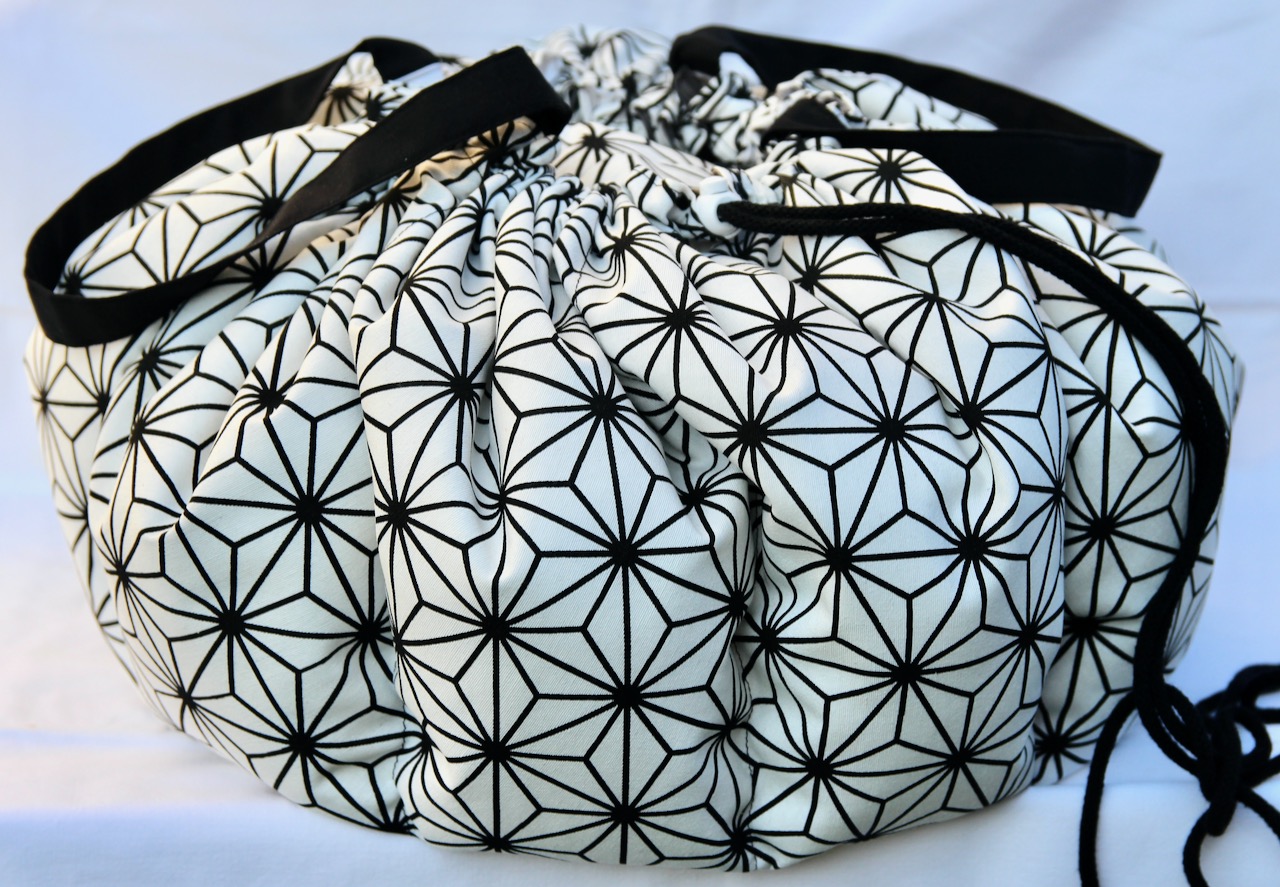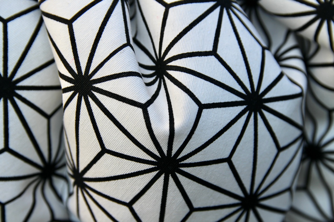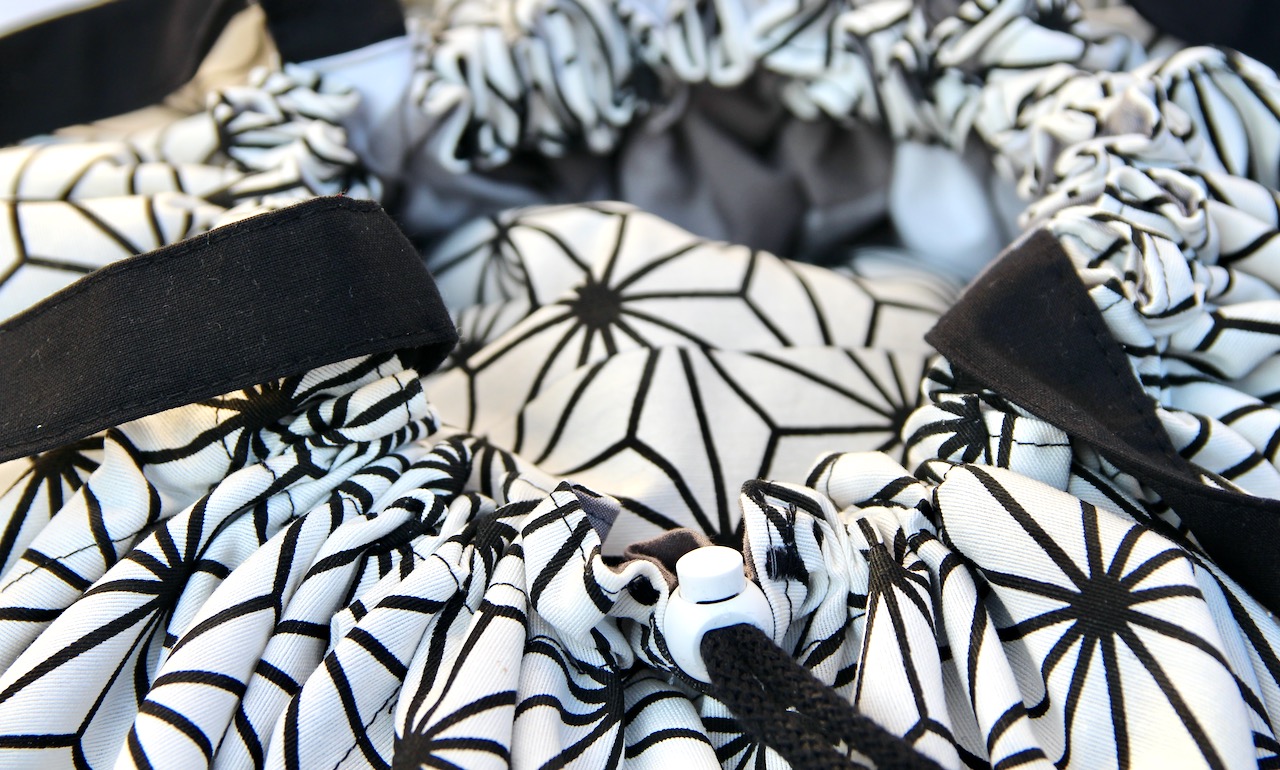 Das KOsCHino Kochkissen Schwarz-Weiß Groß ist aus festem Baumwollstoff genäht, das Innenfutter ist beige/grau gemustert, hier wurde ein Stoffrest und ein Bettbezug verarbeitet.